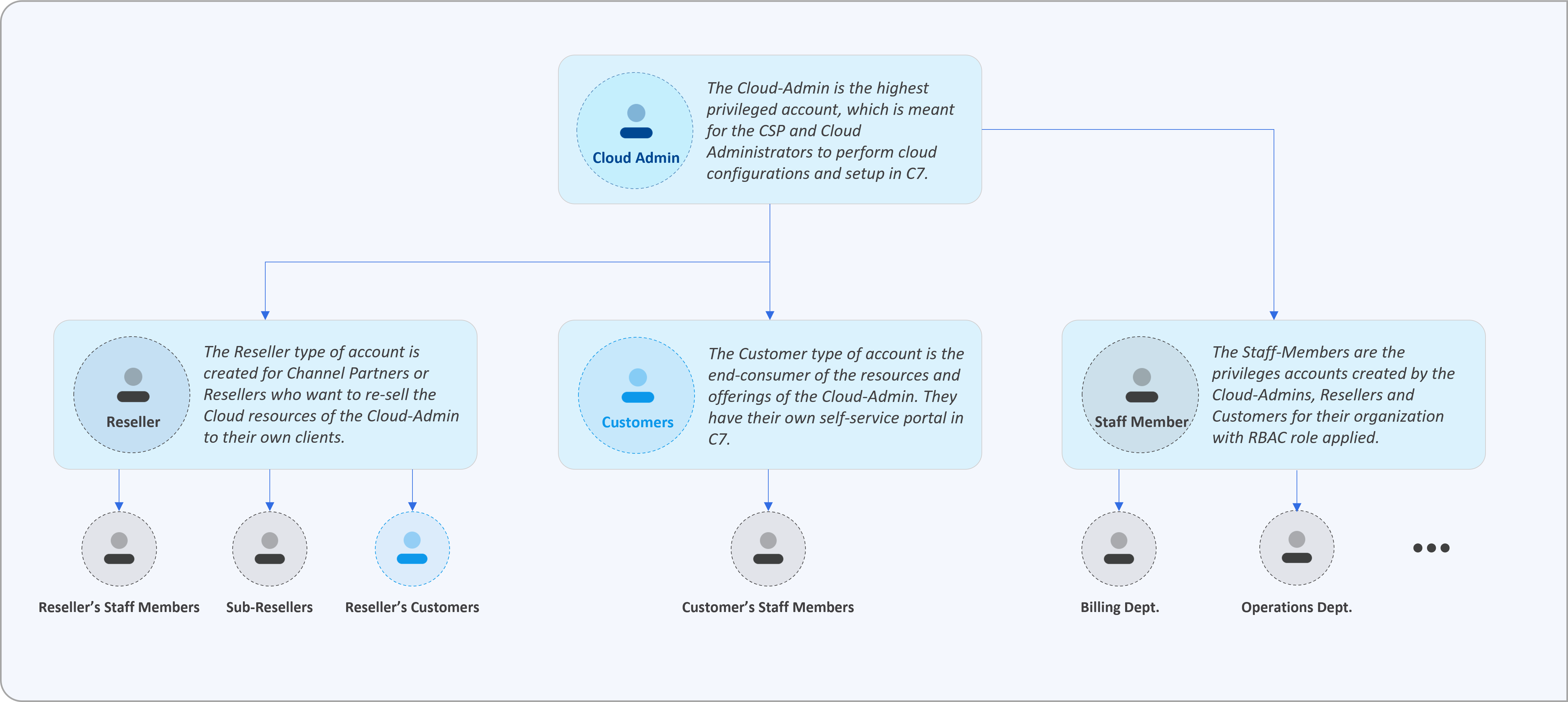 This hierarchical approach not only supports reseller operations but also caters to complex organizational needs, providing flexibility in resource allocation and management within larger enterprises. It enhances operational efficiency by allowing departments to operate semi-autonomously while maintaining oversight and control through centralized management within Cloud7.