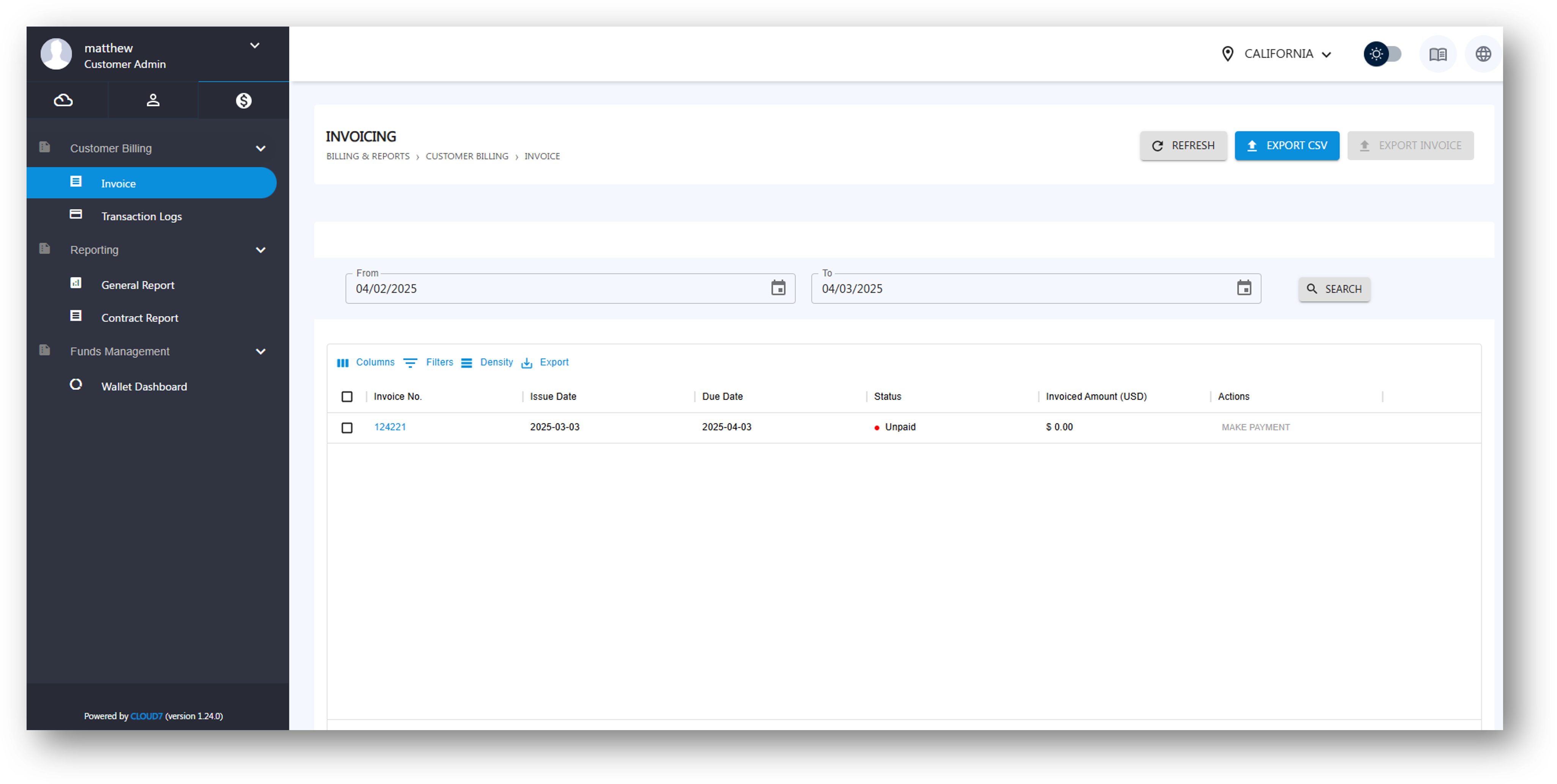 As a Customer, you can define the time range using the search filter available on the invoices listing page. Additionally, you can also capture the online payment for an invoice if the auto deduction is disabled.