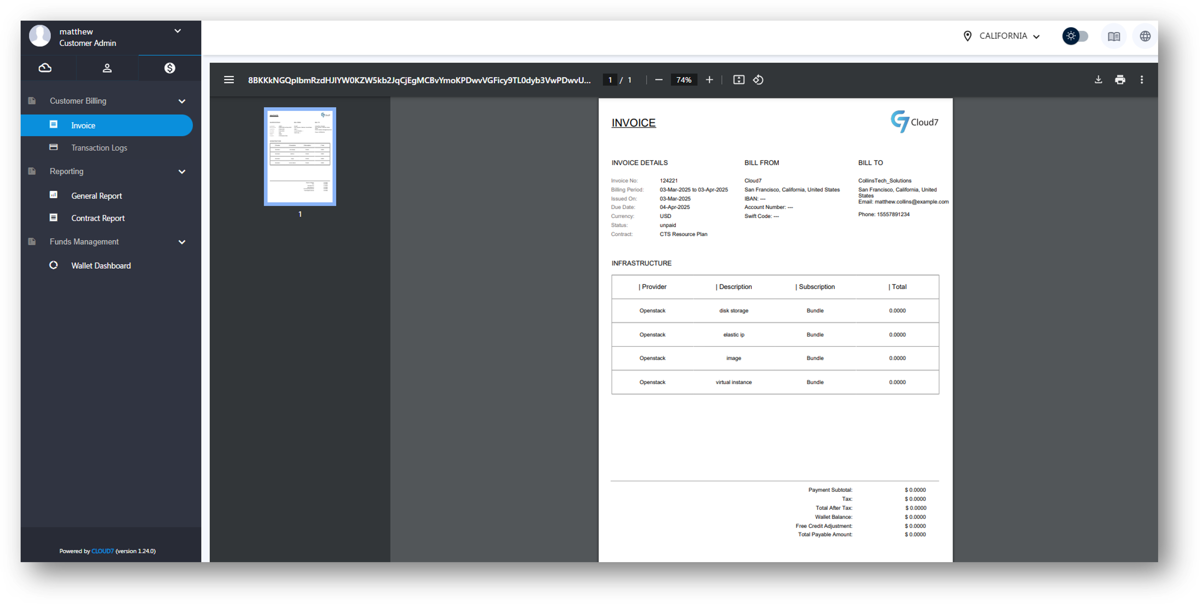 Invoices contain detailed information about resource consumption and associated bills. Cloud7’s billing system is designed to generate a separate invoice for each Resource Subscription. This approach ensures clarity and precision, as each Resource Subscription has its own billing cycle, distinct from other subscriptions. This separation facilitates a clear understanding of costs and resource usage.