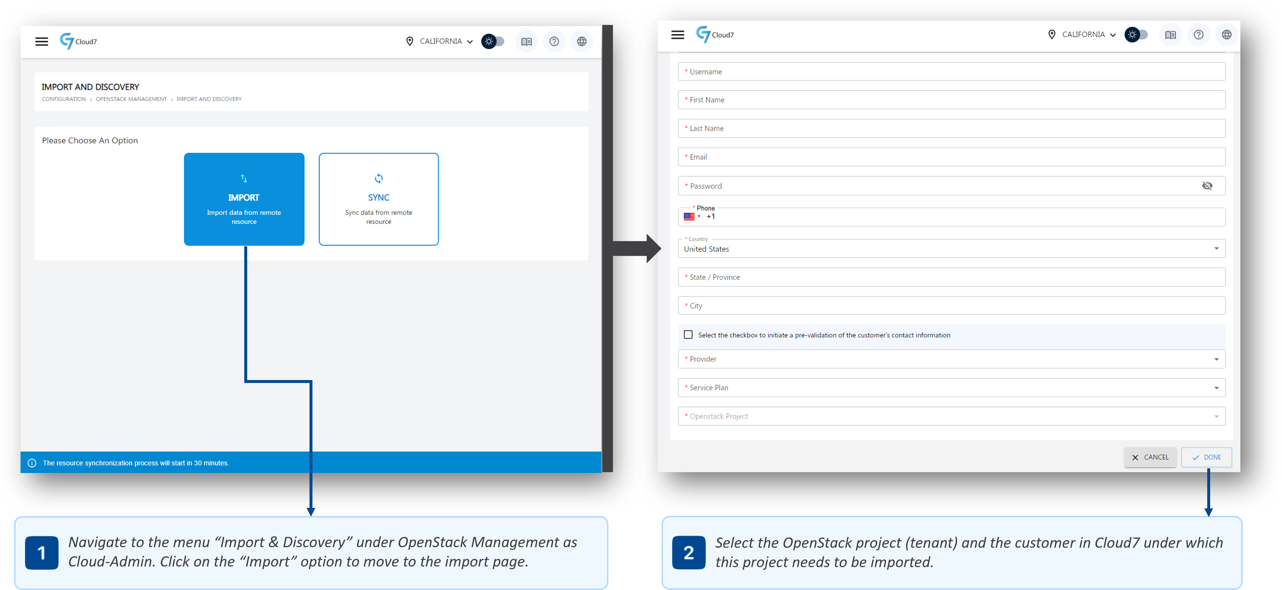 - Map & Import OpenStack Projects: Within the Import & Discovery module, you can map existing OpenStack projects (commonly referred to as tenants) directly to new or existing customer organizations within Cloud7. This mapping ensures a structured alignment of existing resources with Cloud7’s organizational hierarchy, facilitating efficient resource management and visibility.