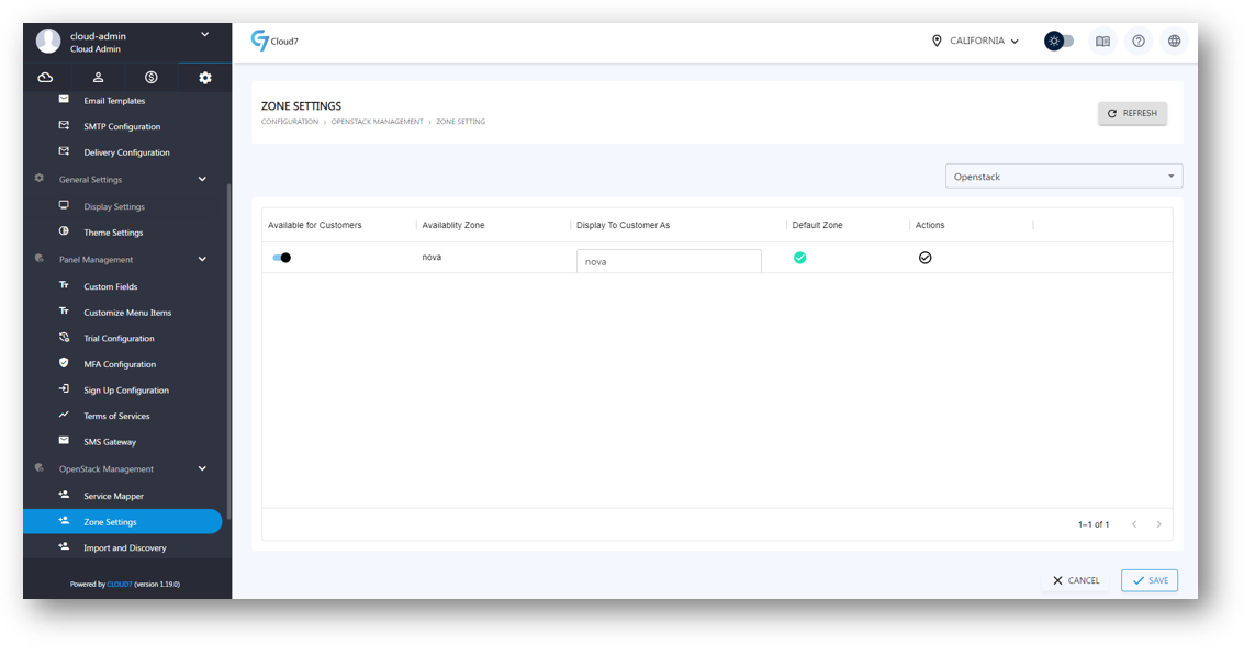 Cloud7 provides a comprehensive view of all available OpenStack availability zones within the Zone Settings menu. This feature allows you to manage availability zones by enabling or disabling them, setting their display priority, and customizing their names as shown to customers.