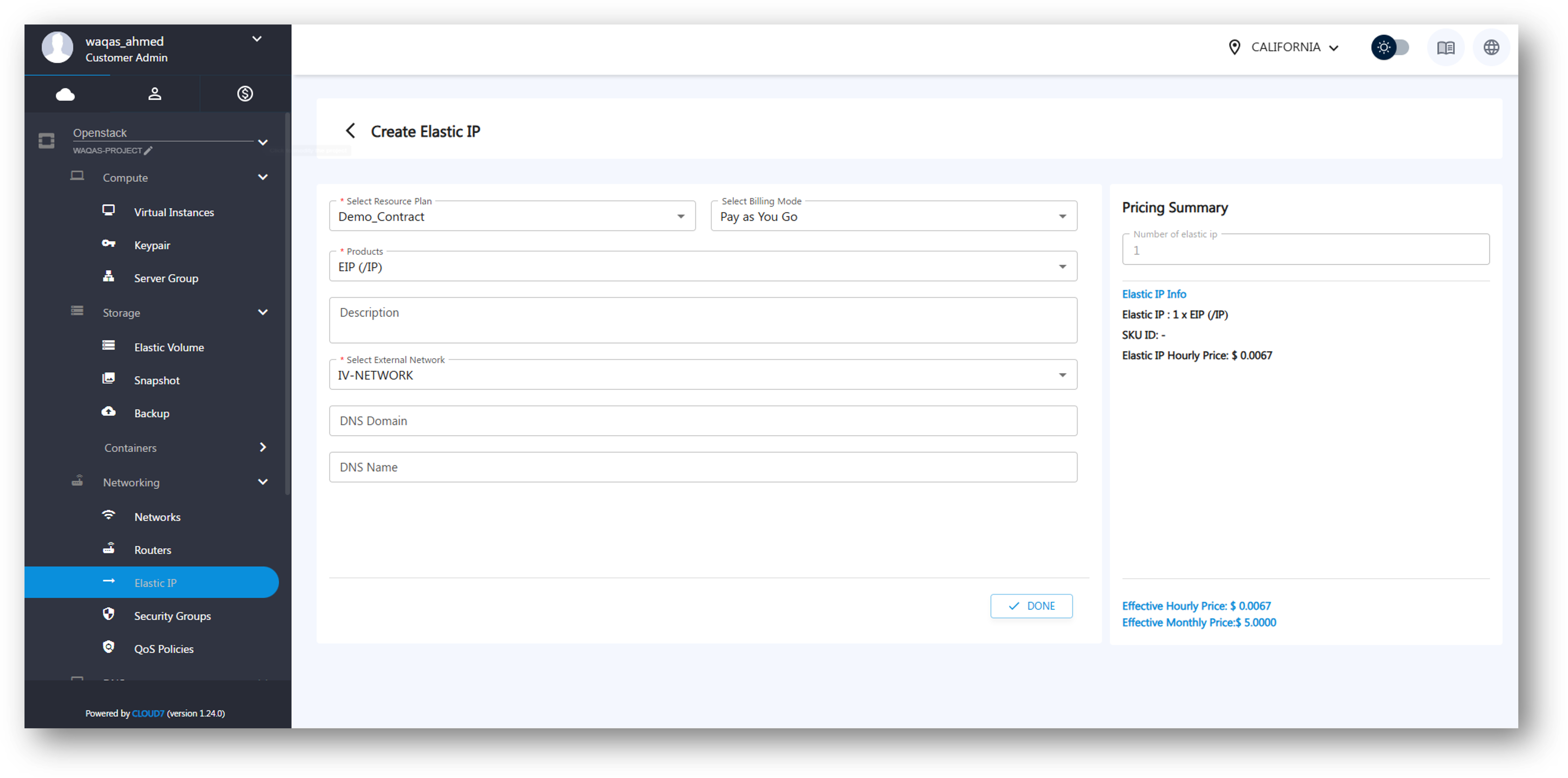 Elastic IPs enable flexible public IP allocation for instances in Cloud7. Customers can create, assign, and release EIPs as needed, ensuring seamless connectivity for their workloads.