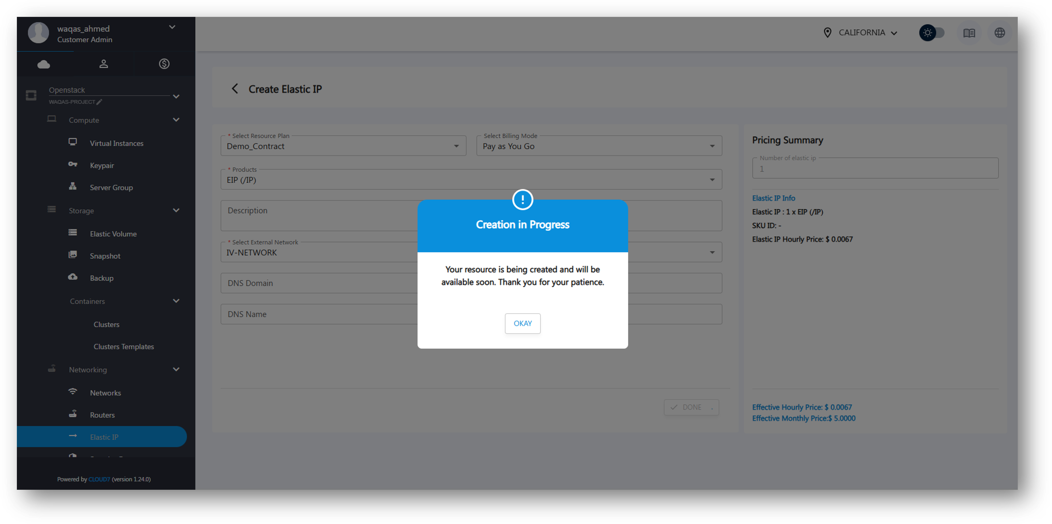 - Click Done to allocate the Elastic IP and a confirmation prompt will appear to confirm the allocation of IP in progress.