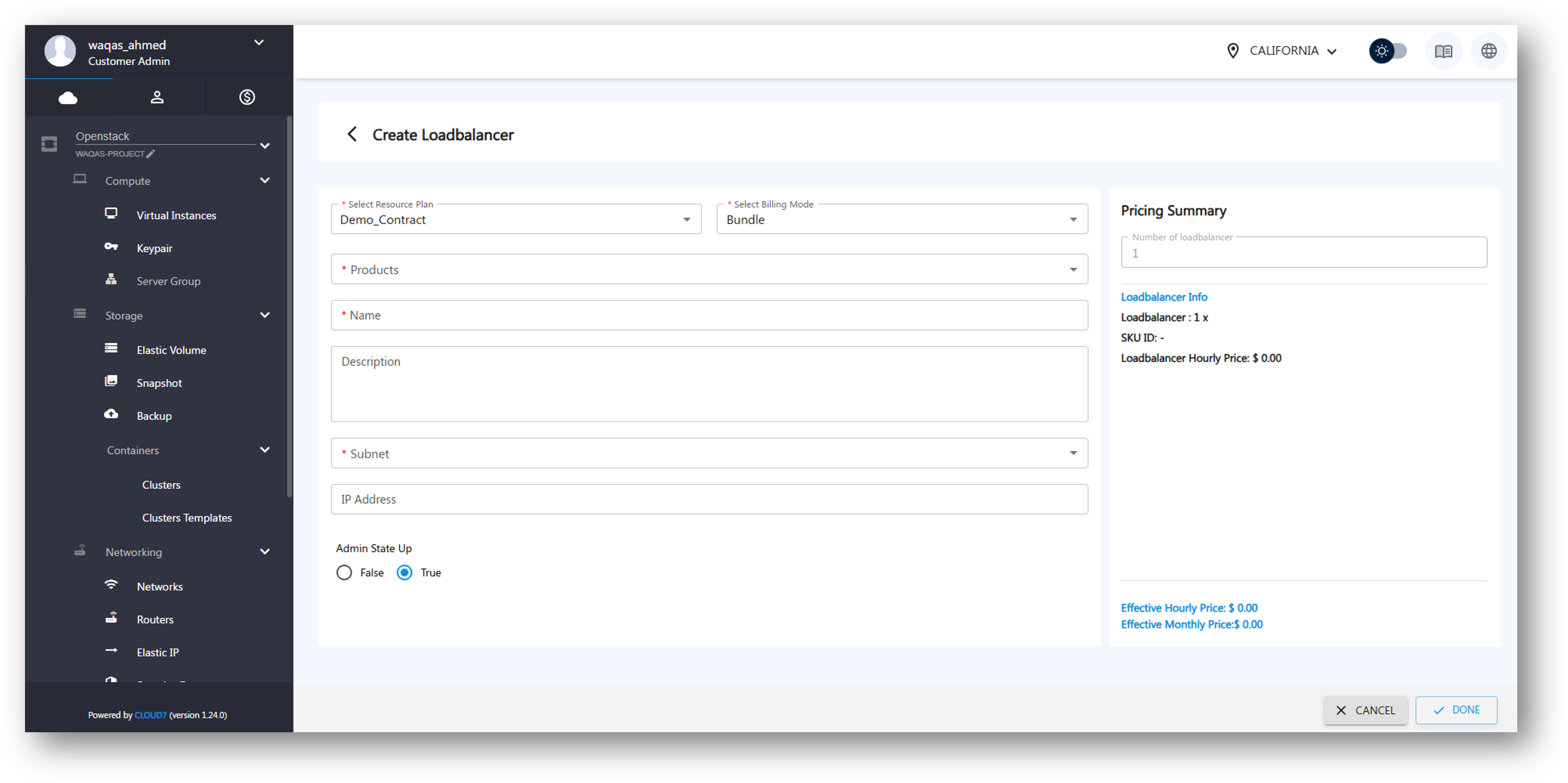 - Admin State Up – Toggle between True (Active) and False (Inactive).