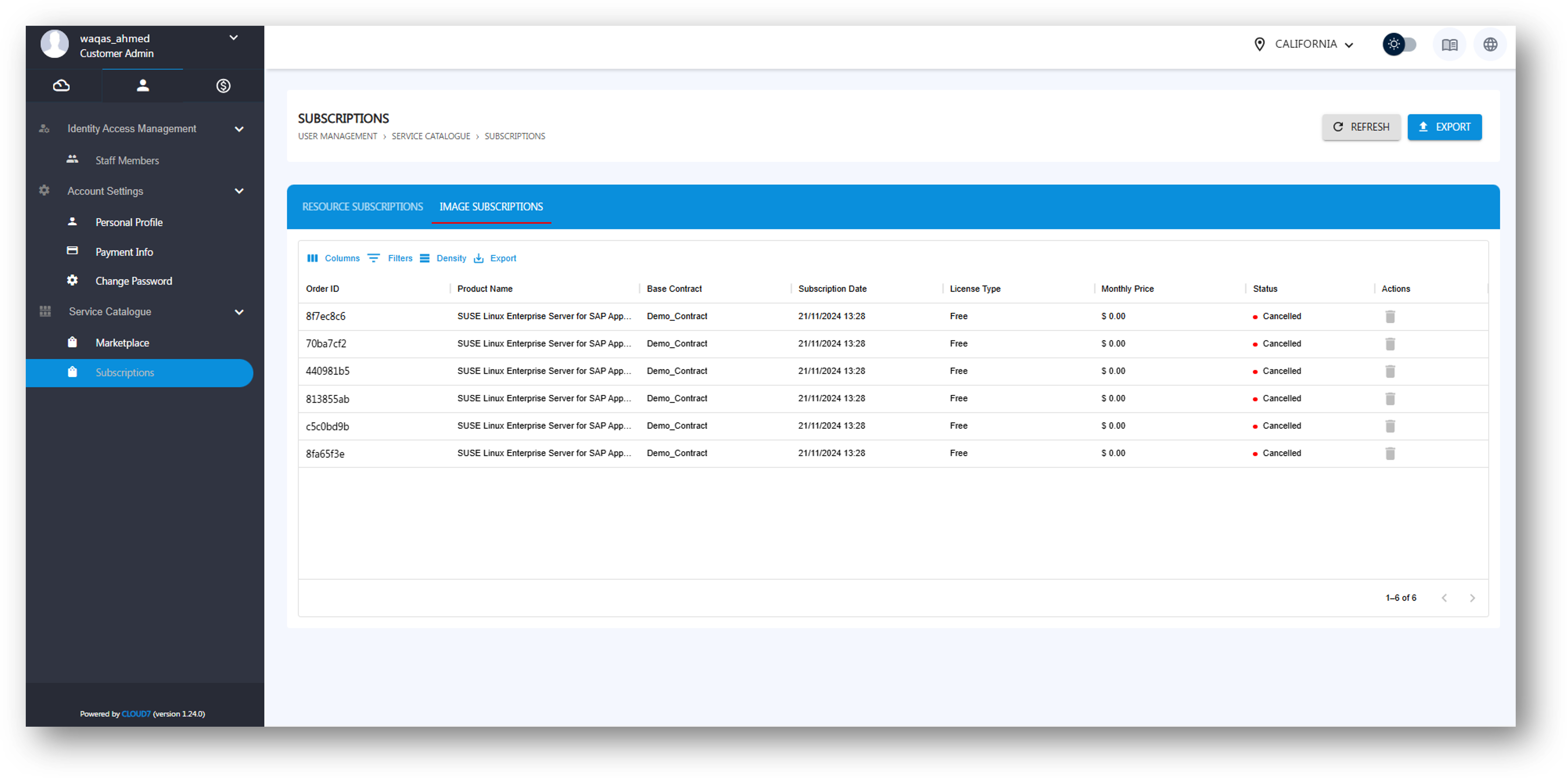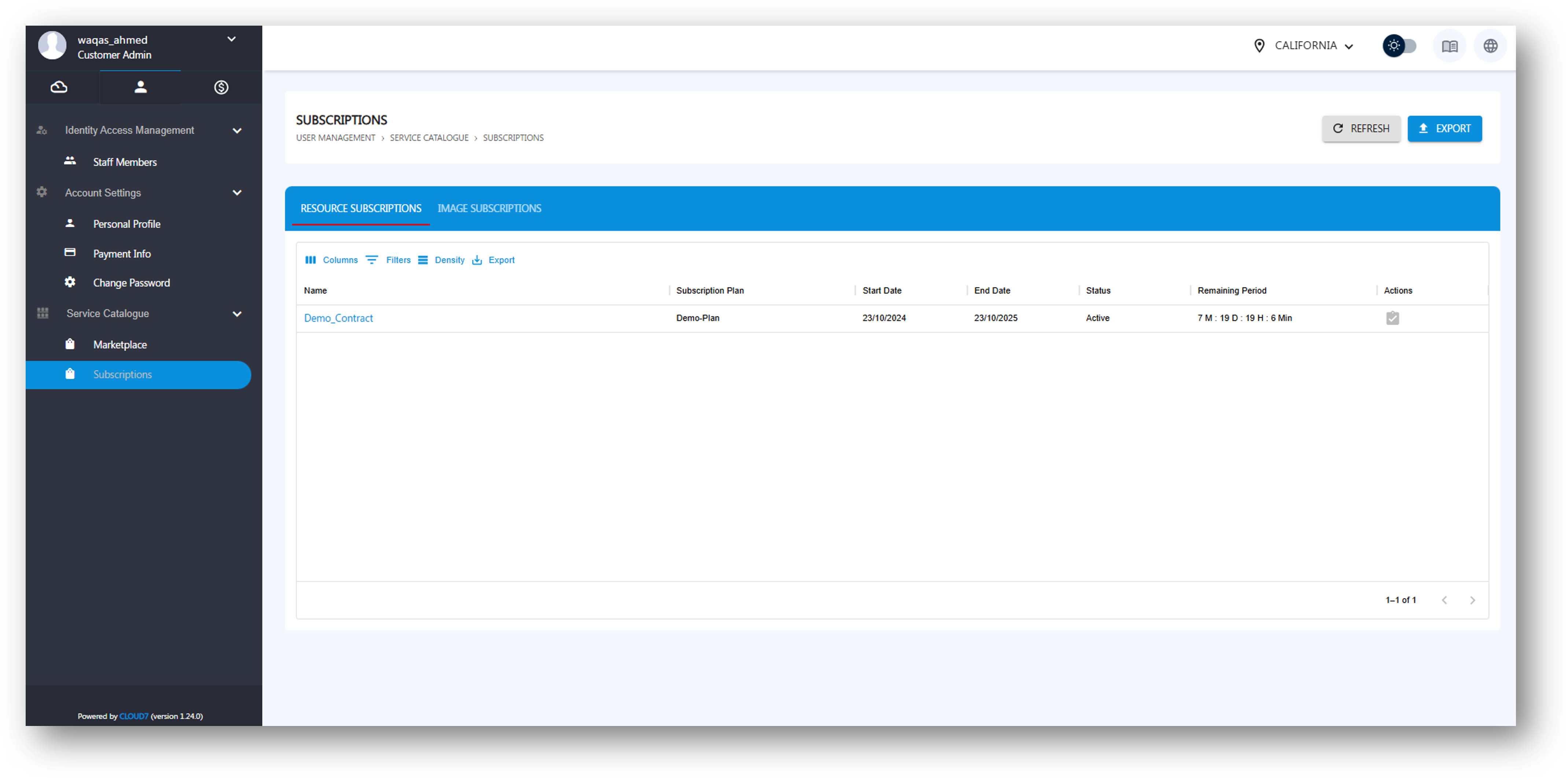 The Subscriptions section in Cloud7 allows customers to manage all their active and past subscriptions for Image-based products and Resource plans. Customers can track the status of their subscriptions, export subscription lists, and manage ongoing services.